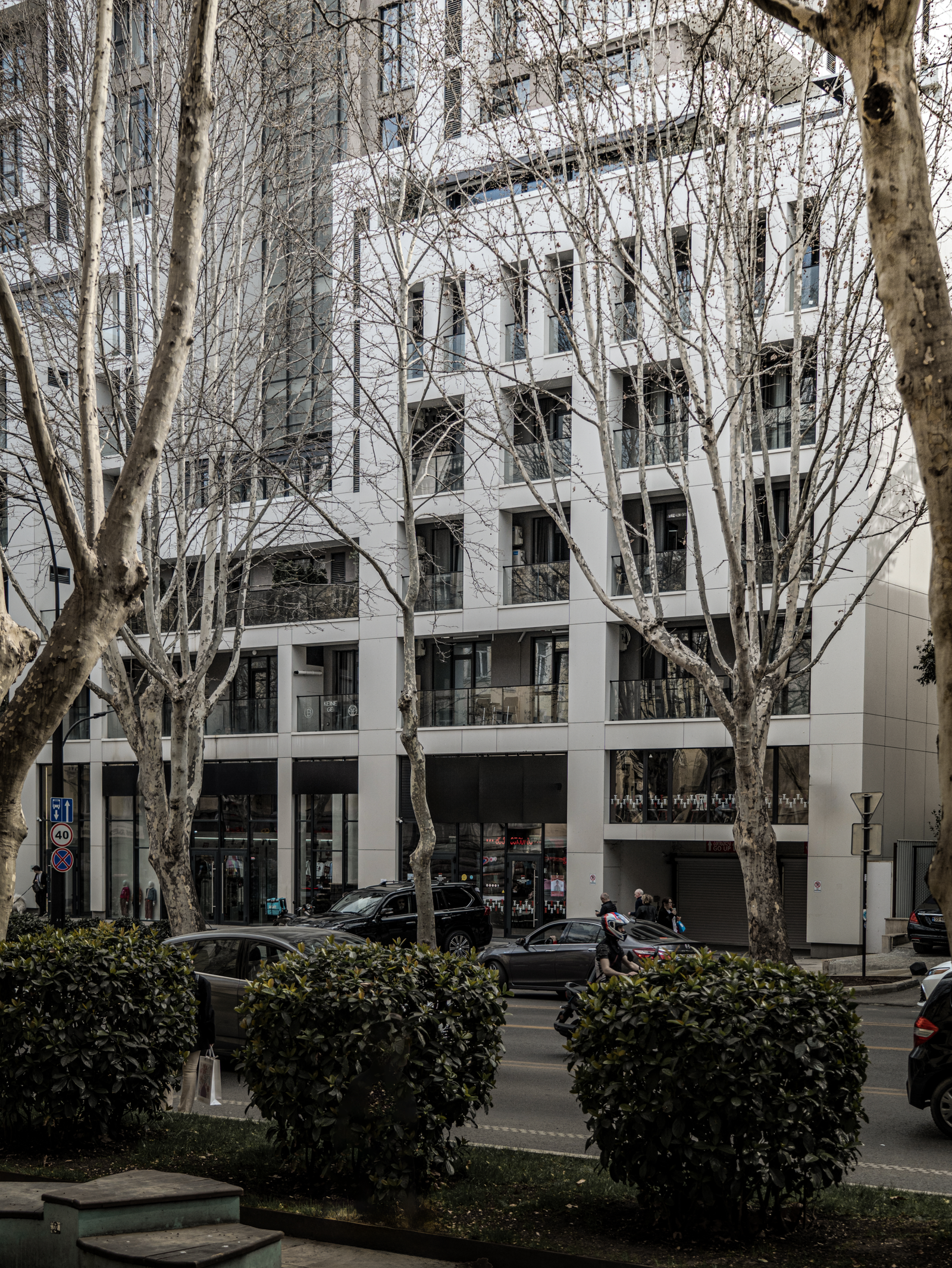 The lower levels of the building engage directly with the public realm. The ground floor is activated by a KFC café and a series of retail units, ensuring continuous interaction with pedestrian life and contributing to the commercial vitality of the street. These functions create an inviting and active frontage, transforming the base of the tower into a lively urban zone rather than an isolated residential entrance.