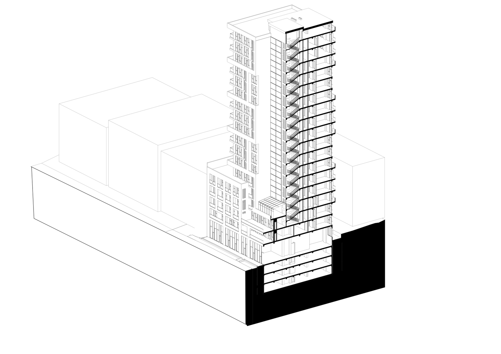 Office spaces are located on the second and third floors, forming an intermediate layer between the public commercial ground floor and the private residential levels above. This arrangement supports a clear hierarchy of use, where business activity and professional environments are positioned close to the city’s daily flow, while residential spaces remain elevated and protected. The mixed-use organization enhances the building’s functionality throughout the day, generating activity across different time periods and contributing to the district’s continuous urban rhythm.
