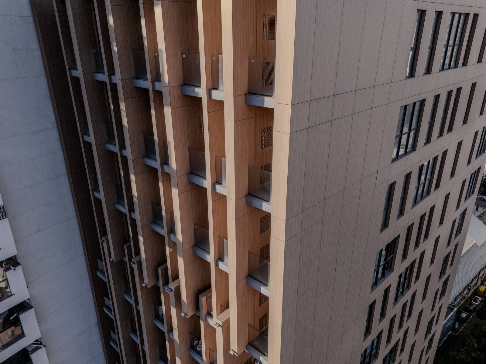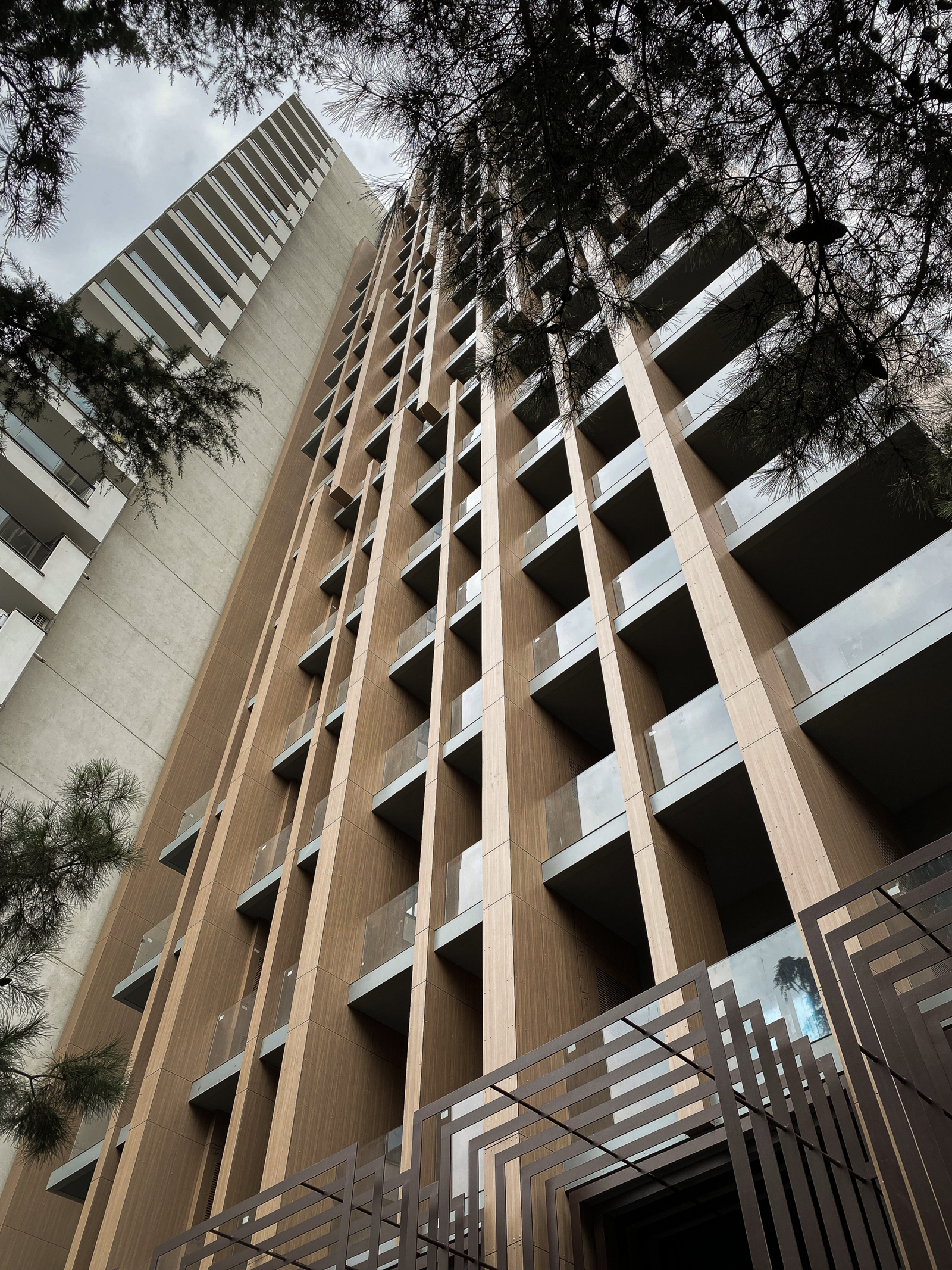The façade plays a central role in shaping this identity. Predominantly clad in HPL (high-pressure laminate) panels, the exterior achieves a contemporary appearance while avoiding excessive transparency. The material provides durability, texture, and a refined surface quality that distinguishes the building from the glass-dominated skyline of many modern towers. At the same time, the façade composition is carefully calibrated to respect the surrounding context, ensuring that the tower does not appear alien or disconnected from its environment.