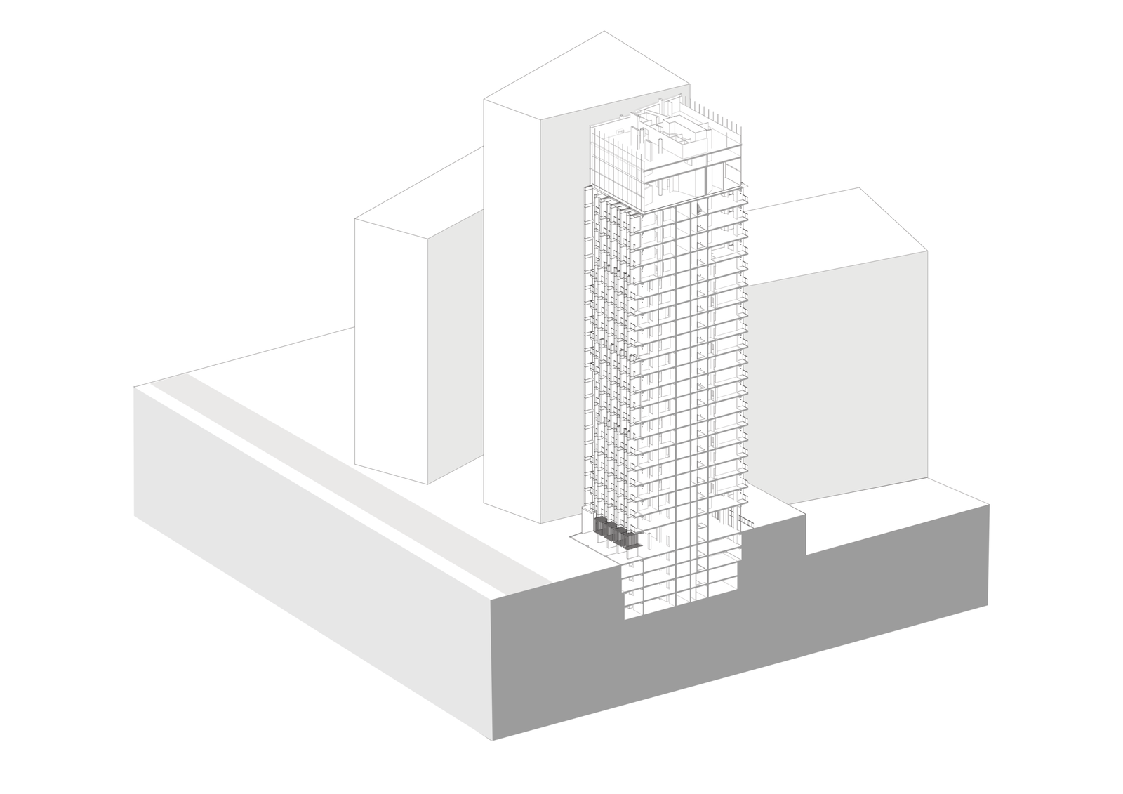 The tower’s form and architectural language assert a distinct identity within the city, establishing Orion as a contemporary landmark while remaining responsive to its setting. Its mixed-use program contributes to the vitality of the area throughout the day, with the café and offices generating activity during working hours, while the residential apartments ensure continuous presence and life beyond business time.