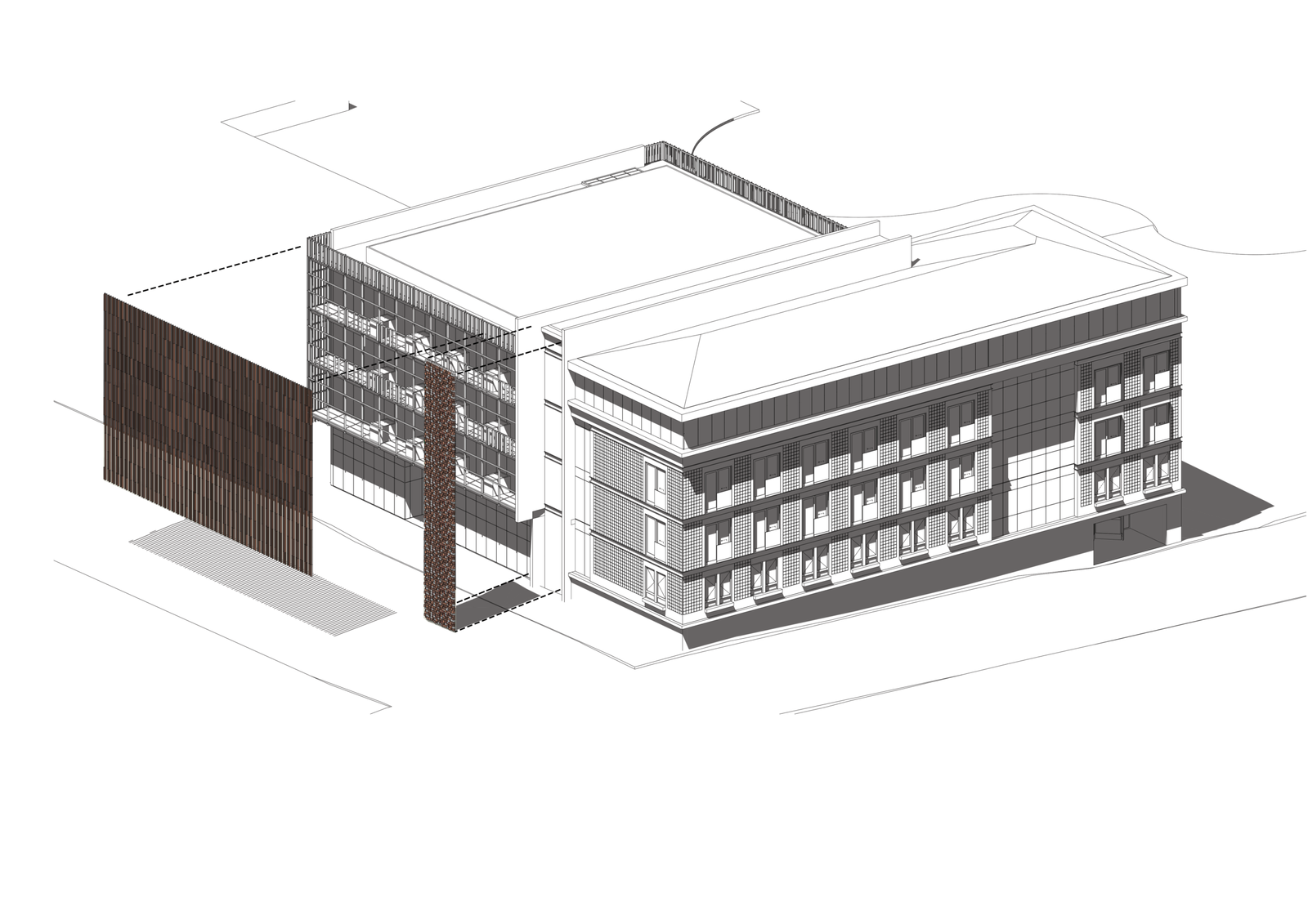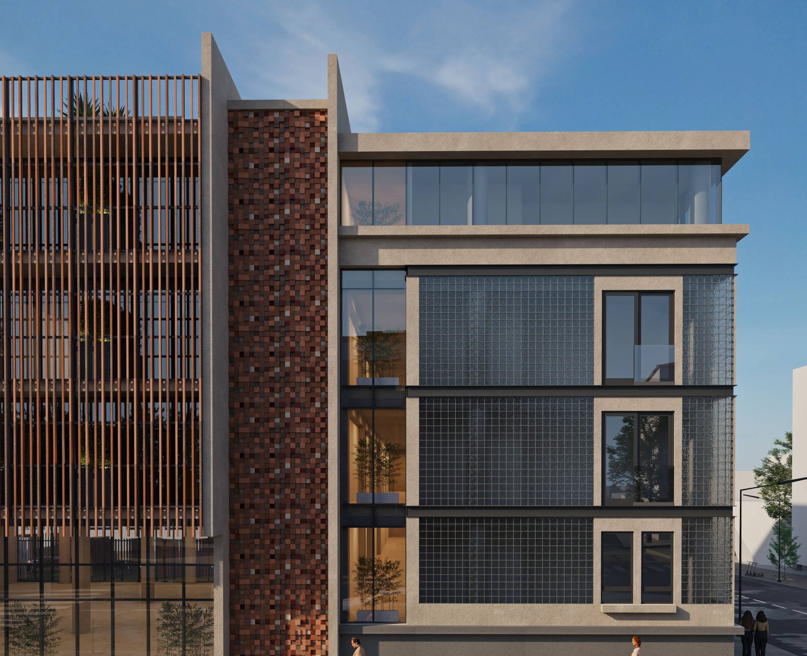 The building spans two facades along the intersection of Lomouri and Abdushelishvili streets, responding directly to the corner condition and the dual street presence. This positioning allows the hotel to engage with both streets equally, creating an active urban frontage that contributes to the vitality of the neighborhood. The massing of the project is divided into two distinct segments, a design decision that reflects the fragmented and uneven development pattern typical of this part of Avlabari. Historically, buildings in the district have emerged incrementally, adapting to changing needs, site constraints, and the irregular geometry of the streets. By dividing the volume, the hotel echoes this layered growth, avoiding a monolithic appearance and instead creating a composition that feels more closely aligned with the existing urban fabric.